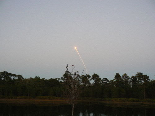 打ち上げ台まで家から直線距離で60キロ。すごくはっきり見える。 夏時間が始まったため、外はまだ明るく西の空の夕日にシャトルの白煙が照らし出されきれいだ。