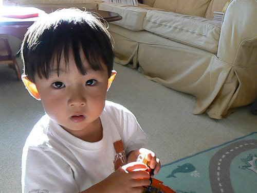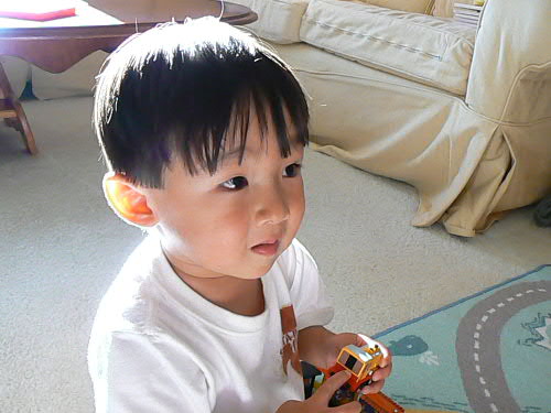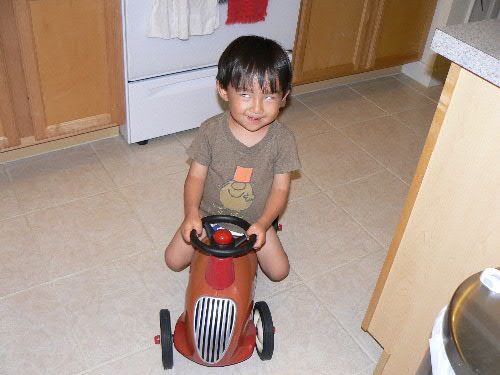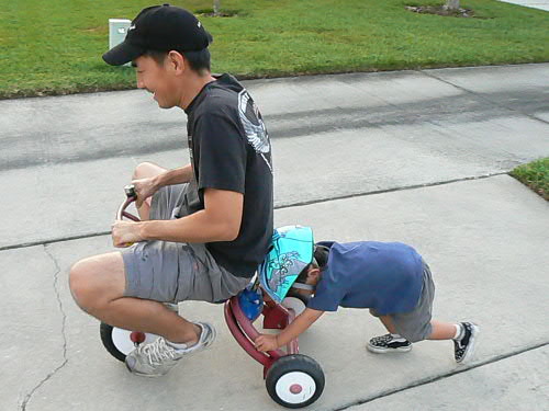 こうやってダディを三輪車で押して、芝生に突撃!! この光景を見て、いったい近所の方たちはどう思っていた事か。。。