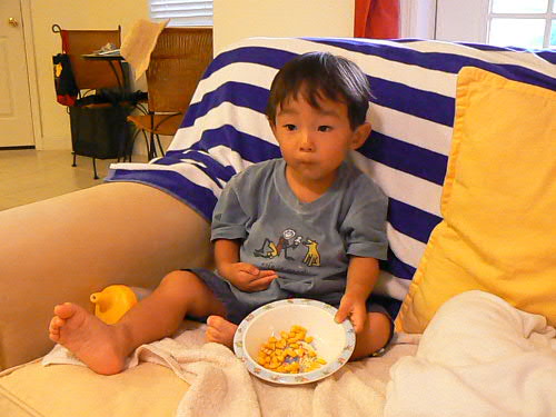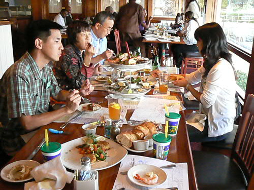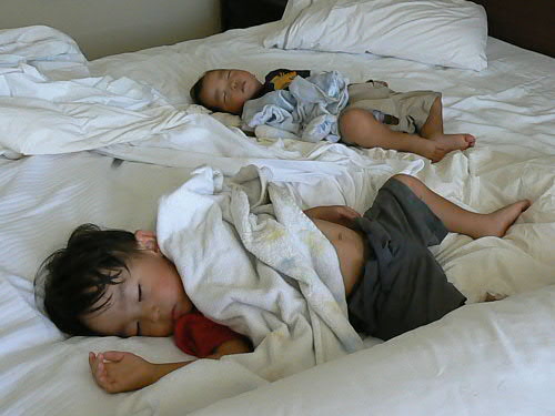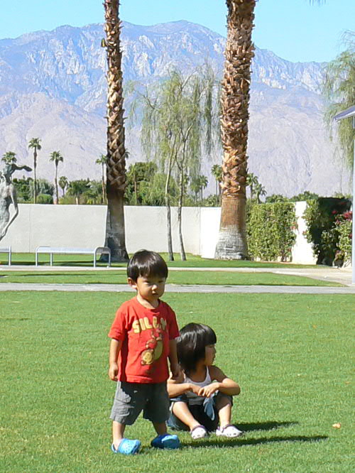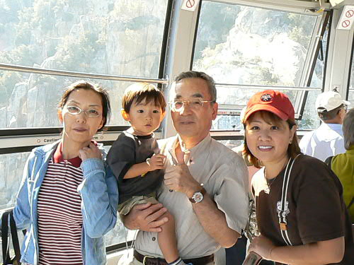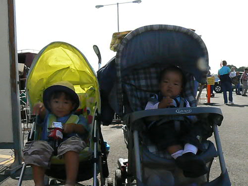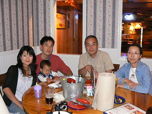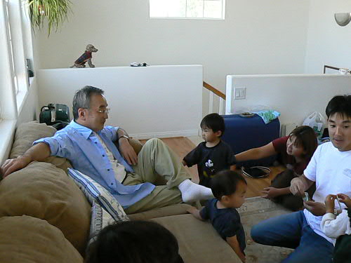 去年ジョージアへ行って以来、ダディとマミーの転職等々で遠出をしてなかったカイ一家。 やっと1週間の休みを取って、ダディの弟一家の住むロスへ行ってきました。 日本からはダディのお父さん、お母さん、ダディ一家ととても親しいちーお姉ちゃんが来てくれて、ちょっとしたFamily Reunionとなり、カイトは大興奮!! とりあえず飛行機の中ではおりこうさんにしていてくれて、第一関門突破(でも、飛行機が着陸体勢に入ったら"Airplane falling down (飛行機が落ちてく~)"って大声で、それも繰り返して言い始めたので、思わず口をふさいでしまいました)。 ロスについてダディの双子の弟(おじちゃん)とご対面。。。やっぱり不思議だったらしく、おじちゃんに"Two Daddy(二番目のダディ)"ってあだ名をつけてました。 2人が一緒にいればどっちがダディかわかるけど、一人ずつ見るとやっぱっり間違ったりしてたね~。 まずはTwo Daddyのお家へ行って、いとこのしーちゃん、慎ちゃん、恵ちゃん(2人のママ)に会って、日本組が到着。 マミーはちょっと出かけてたけど、子供3人で皆様にご挨拶したそうです。 カイトにそっくりさんのじいじと。 右端に写ってるのはカイダディではなくてTwo Daddyです。 この日からロングビーチで二泊。 とにかく元気な日本組はモールへお買い物、カイ一家は日本のスーパーへ行って買い捲り。 本当にロスは日本のものは何でも揃って羨ましい限り。 買い物中にカイダディは視線を感じていたそうで、後から聞いたのですが、Two Daddyのお知り合いがスーパーにいて、"何で違う子を抱いてるんだろう?"って不思議に思っていたそうです。 やっぱり似てるんだね。 初日から美味しいシーフード!! ヨットハーバーが見える席だったので、子供たちもヨットを見て喜んでました。 カイトはいつもマミーとダディと3人なので、いとこ達と家族に囲まれてすっごく喜んでちょっと調子に乗ってました。 マミーもダディも満腹になって大満足!! 懐かしい話をおつまみに、皆で楽しい食事を終えてホテルへ。 翌朝のホテルでの朝食も美味しかった。 カロリーを消費するために、恵ちゃんとTwo Daddyお勧めのロングビーチフリーマーケットへ。 日本からのバイヤーっぽい方たちもちらほら見かけました。 今日の掘り出し物は、マミーが売ってるおじさんに怒られながら買ったカイトのブリキの電車。 $20を$10にしてくれって交渉してOKがでたのに、もっとまけれる??って聞いたら、おじさん怒ってしまって"オマエには売らないぞ!!"だって。 でも、恵ちゃんも同じおじさんに怒られたらしいです。 慎ちゃんのストローラーが直射日光浴びてたら"子供に日が当たってるだろうッ!!"って。 きっといつも機嫌が悪いんだろうね、このおじさん。 カイばあばも掘り出し物をしっかりとゲットしたし、皆もガラクタの中に埋もれて売られてる珍しい物を見て楽しみました。 肝心の子供達は。。。 暑かったし、危ないものが多いから放し飼いにできなかったし、ちょっと飽きちゃってカワイソウだったかな(特にうるさいカイは大騒ぎでした)。 この後おいしいベトナム料理、夜はババガンプでシュリンプ三昧。 本当に良く食べたバケーション前編でした。 Two Daddy一家(しーちゃんがいないな~)、カイじいじとちーお姉ちゃん。