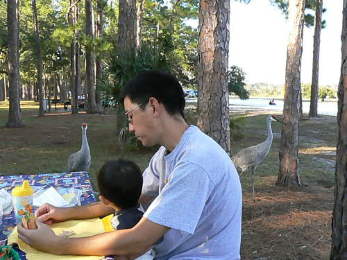 オーランドにお住まいの方々はご存知かと思いますが、空港の南側にあるオレンジ郡の公園、Moss Parkへ行ってきました。 お出掛け好きの私たちなのになぜか初めての訪問 軽いハイキングコースもあって、鹿もまじかで見れたし、なかなか楽しめる公園でした。 ハイキングトレイルを歩いている人はだっれもいなくってちょっと不安な面もあったけど、お散歩好きの私たちには良かったかな。 カイちゃんは平気で地面に"ドンッ"って座っちゃうから、おズボンが砂だらけになってしまいました。 そうそう、この公園のトレイルを歩いていて驚いたのが、地面はほとんど砂で貝殻もたくさん落ちてるんですよね~。 大昔は海面下だったなごりかな?? このまま地球が温暖化してしまうと、また海面下になってしまうかも知れませんから、皆さん、少しずつでも"Green"な生活を心掛けましょう 皆で丸太(マミーの事じゃないよ)に座って一休み カイちゃんはずっとダディの背中にしょわれてたから疲れてないんだけどね。 お散歩の後は軽くピクニックをしてお昼を食べていると、カイちゃんが大きな鳥さんに向かってブドウを投げてしまし、この通り鳥さんたちが寄ってきてしまいました。 Moss Parkの子供の遊具は結構充実していて、カイちゃんもダディもすっかり楽しんでましたね~。 大人$1の入場料でいろいろ楽しめるMoss Park, オーランドに住んでいて小さいお子さんがいる方たちにはオススメです!! カイはこの後、プラスチックに思いっきり突入してしまいました。