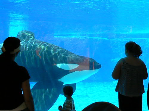 シャチ(Shamu)の前に立っているのは2歳のTくん。