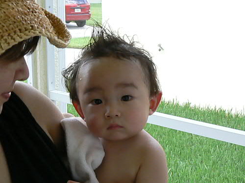 髪の毛はびしょびしょで、ちょと新しい髪型に挑戦