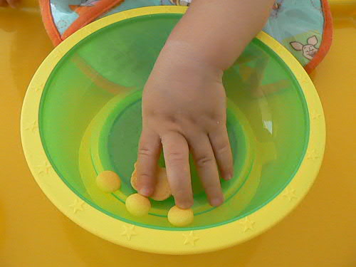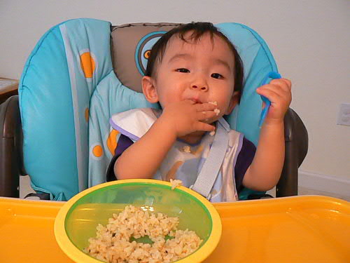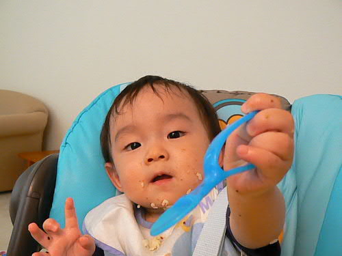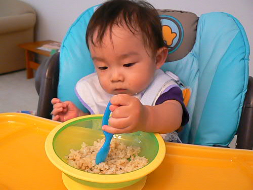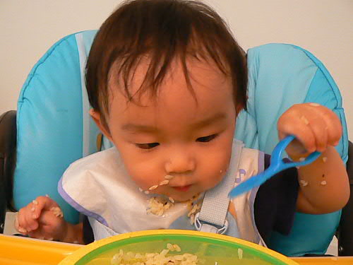 最近、カイトは一人でご飯を食べる練習をしてます。