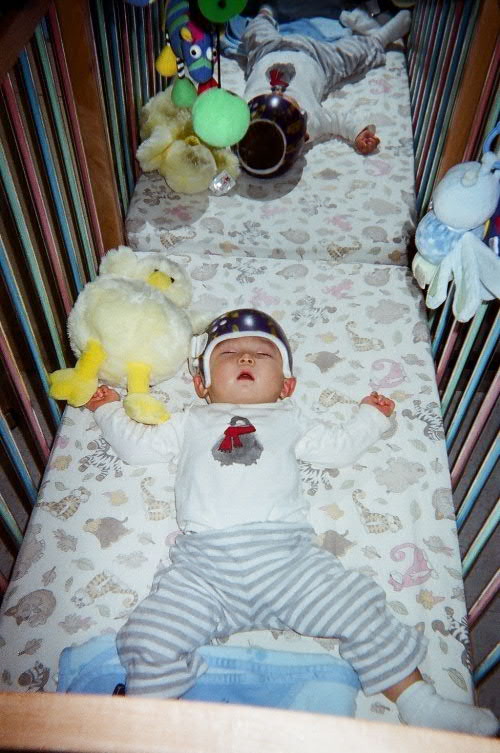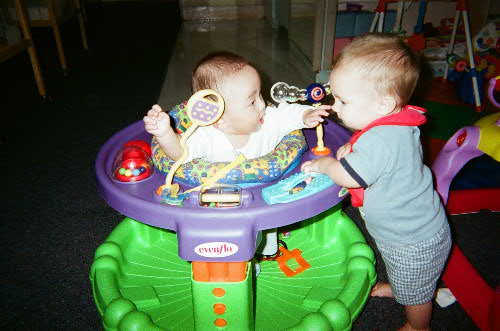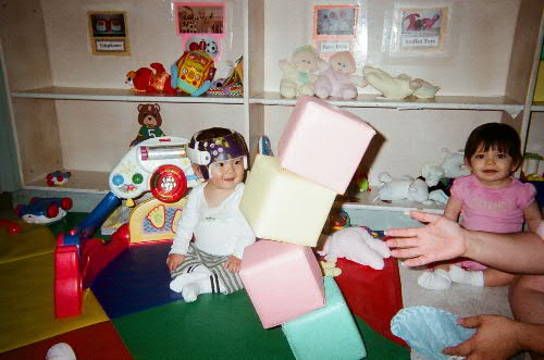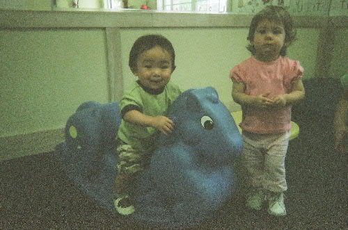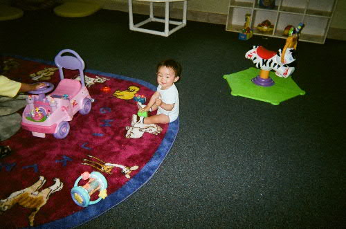 同じ部屋の子と、こうやって一緒に遊んでいたようです。 ハゲ具合がすっごくいい感じ 次はルーム150へ。 100からずーっと一緒のKellyちゃんと一緒に遊んでる所です。 このヘルちゃん、懐かしいな~。 この頃からお昼寝も減って皆とたくさん遊ぶようになったので、お昼寝のときはこのように激しく寝ていたそう このお部屋までは自分のクリブがこうやってあったんだよね。 ついこの間なのに、なんかもう遠い昔のように感じます。 それにしてもすっごい寝方だね... 3週間前に、200へ移りました。 ここでは、皆でマットを床に引いてのお昼寝なので、部屋はとっても広くっておもちゃの種類も変わって、ハイハイ盛りのカイちゃんにはとてもよい環境です。 この写真、今日先生が撮ってくれたらしいんだけど、フラッシュがないのでボケボケ。 でも、カイちゃんの最近のお気に入りのゴムでできた木馬なので載せてみました。 このSarahちゃんも100からずーっと一緒。 こうやって見ると、あっという間に赤ちゃんから少年(?)に成長してしまったカイちゃん...あんまり早く成長しなくていいよ~。 マミーはまだまだカイちゃんには赤ちゃんでいて欲しいです。