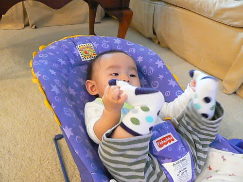 なぜか最近は足が大好きで、こんな格好もしばしば。。。カーシートでもこうやっていて良く靴下を脱いでしまうので困ってます。