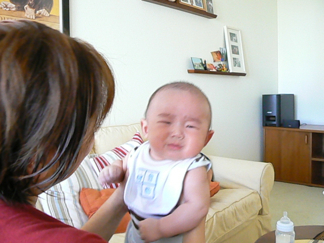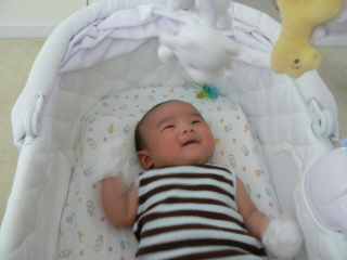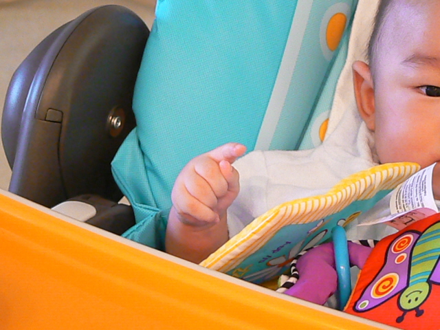 赤ちゃんて本当に飽きっぽいですよね。 カイちゃんもいろいろな遊び方を覚えてきたせいか、あまりひとつのおもちゃや遊びが長続きせず、パパとマミーは30分ぐらいごとに他のアクティビティーを考えなくてはいけません。 "カイちゃんをどれだけ長く泣かさないでいれるかゲーム"の毎日です。 という訳で、一つ立派なおもちゃを購入しました。 おもちゃに囲まれた円盤いすです。 これも15分かっ、とあまり期待してなかったけれど、ある日私がお友達とべちゃくちゃ電話で話すところ40分...カイちゃんは円盤のなかでじっとしてました。 まだ、おもちゃに手も届かないし見るだけだけれど、なんか楽しかったみたい。(実は足も届いてないので、クッションで底上げしました。) とりあえず気に入ってくれたので、あまり乱用せずそこそこに利用します。 あと、このぐらいの赤ちゃんって手の動きにとても興味があるらしく、ただ"One!!"とかいって指を差し出すと、"ウッキャッキャッキャ!!!"って喜んでくれます。 二週間ぐらい前からカイちゃんも、"ん~、僕もやってみるぞ~"と思ったらしく、Oneって言うとこのように一本指を差し出すようになりました。 今では結構得意げにしょっちゅうやってます。 この頃から利き腕ってあるのか知らないけれど、カイちゃんはおもちゃをつかむのも左手、振り向くのも左が多く左利きかなって思っていたけど、Oneは何故か右なんです。 ところで、私はしーママがカイに歌ってくれてた"お父さん指が風邪ひいた~"歌を見よう見まねで適当にカイちゃんに歌ってました。 でも、適当に作ったバチがあたり、家族全員風邪で寝込みました。 PR |