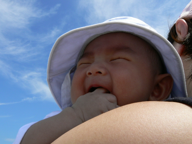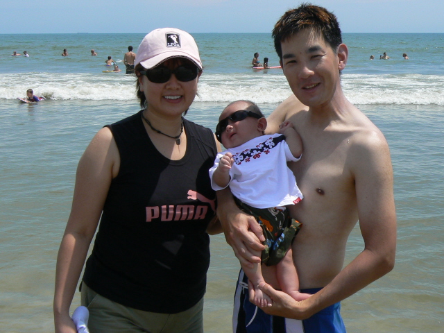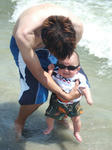 Kytoの日本名は"海人"です。 パパとマミーのホームタウンも海に面していたし、フロリダも海に囲まれていたので、フロリダの海のように澄んだ広い心をもった子に育ってほしいと願ってつけました。 海の人なんだから海が好きに違いないっとおもったのは大間違い... この通り、ちょっと足をつけただけで泣きべそをかいてしまいました。 浜に上がって抱っこされたとたんに、この通りの笑顔!! しーちゃんママがあやしてくれたからなんだけどね。 海の人じゃなくて浜の男、"浜男"にでもすればよかったかね~。
