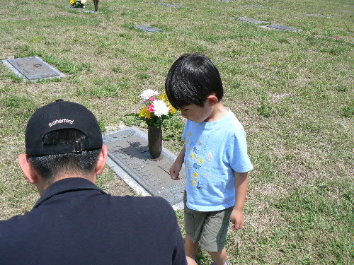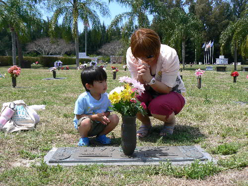 カイトは一歳の時から毎年きてるけど、今年初めてちゃんとダディのお手伝いをして、お墓のお掃除をしたりお花をかざったりしてました。