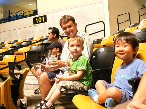 普段テレビで見てるセサミストリートを生で見れたのが嬉しかったようだが、実は食べることに夢中になったカイト。スティーブンのパパは息子を溺愛してて、欲しいものは何でも買ってあげる。隣のカイトはポップコーン、アイス、ホットドックと、スティーブンが口から出したホットドックまでも食べようとする有様。もちろん、用意しておいたカイトのスナックを瞬く間に平らげてから。ちっこいのにこんなに食べる子は見たことないとはスティーブンパパのコメント。確かに... うちはあまりジャンクフードは買わないので、たまに食べるジャンクが美味しんでしょう。あまりに食べすぎて、ショーのクライマックスをトイレの便器で迎えたカイト、どんくさいというか何というか?