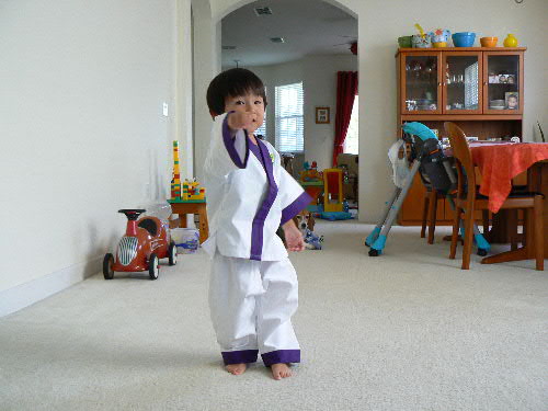 カイトのたっぷりのエネルギーを少しでも消耗させようと、また、セルフデフェンス(自己防衛、なんか自衛隊みたい)、リスペクト(尊敬の念)を学んだほうがいいとの事で、空手をはじめました。