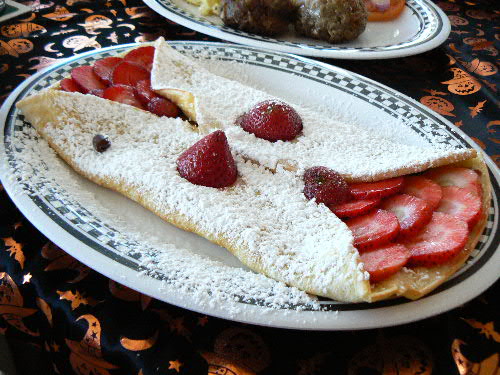 お店は東ドイツから移民した夫婦が経営しており、クレープがおすすなので、カイトにこれを注文した。奴は苺と粉砂糖しか食べなかった。見た目通りに美味しかった。他にソーセージ、ミートボールを食べたがどちらも◎。付け合せのジャーマンポテトは日本のポテトサラダのようで美味しかった。